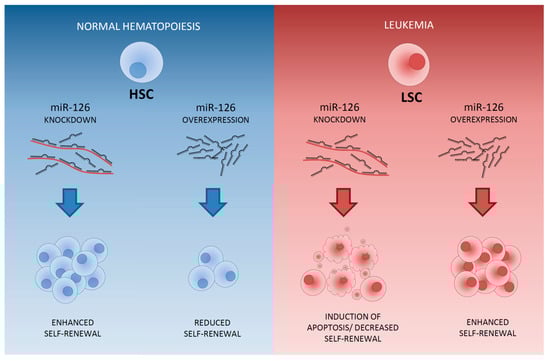 MiRNAs that are higher expressed in LSCs than in leukemic progenitors are miR-126-5p, miR-126-3p, miR-22, miR-335 and mir-150. MiR-126 is the top miRNA differentially expressed between CD34+CD38- LSCs and CD34+CD38+ leukemic progenitors. MiR-126 is high expressed in LSCs and even more enhanced in HSCs [] (Figure 3). Moreover, miR-126 is part of an LSC-associated miRNA signature that was derived from functionally validated AML LSCs and its expression has been linked to LSC activity []. Patients with high miR-126 levels co-express genes that are present in stem cell gene signatures [,], implicating that miR-126 influences stem cell properties and maintenance of “stemness” in both normal and leukemic stem cells. In AML, high miR-126 expression is associated with poor survival and a high chance of relapse [,,], reflecting the association of enhanced miR-126 activity with a decrease in chemotherapy sensitivity []. Both the overexpression and knockout of miR-126 result in enhanced leukemogenesis in cooperation with the t(8;21) fusion gene. MiR-126 overexpression has a stronger effect on long-term survival and progression of AML1-ETO9a-mediated LSCs in mice than does miR-126 knock-out []. Knockdown of miR-126 led to differentiation, apoptosis and reduction of AML growth [,] but also enhances responsiveness to chemotherapy []. Most importantly, targeting of miR-126 specifically reduced the clonogenic capacity of LSCs and leukemic progenitors without affecting normal HSCs [,] (Figure 4). Moreover, miR-126 targeting using nanoparticles resulted in the depletion of LSCs in an AML xenotransplantation model []. This specific effect of miR-126 is due to the opposite function of miR-126 in LSCs and in HSCs [,]. In LSCs, decreased miR-126 attenuates LSC quiescence and overrules chemotherapy resistance []. In HSCs, knockdown of miR-126 results in enhanced hematopoietic stem/progenitor cell proliferation, increases cell cycle progression and increases the number of stem cells (CD34+CD38-CD90+CD45RA-) [] (Figure 4). MiR-126 targets multiple genes affecting the PI3K/AKT/mTOR pathway [,] and its discriminative function in LSCs and HSCs might reflect the opposite function of the PI3K/PTEN signaling pathway in LSCs and HSCs []. The distinct function of miR-126 in HSCs and LSCs makes it an ideal therapeutic target for depletion of LSCs without harming HSCs and potentially even enhancing hematopoietic recovery.