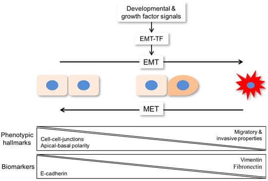 Epithelial-to-mesenchymal transition (EMT) is a complex process in which epithelial cells lose their characteristic features and acquire a mesenchymal-like phenotype []. Phenotypic hallmarks of EMT are the loss of cell-cell junctions, loss of apical-basal polarity, and acquisition of migratory and invasive properties (Figure 1). It resembles a fundamental process in embryonic development and during wound healing. In a pathophysiologic context, cancer cells are able to reactivate the EMT program to gain new properties such as accelerated motility and treatment resistance [].