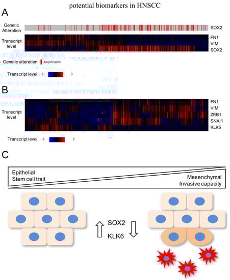 (A) Several well-established mesenchymal marker genes (e.g., VIM and FN1) are elevated in primary HNSCC with low SOX2 expression according to TCGA (The Cancer Genome Atlas; https://cancergenome.nih.gov) (B) Inverse expression pattern between KLK6 and mesenchymal markers as well as key regulators of EMT in primary HNSCC of the TCGA cohort; (C) High expression of SOX2 contributes—among others—to the pathogenesis of HNSCC by promoting tumor cell proliferation. In advanced tumor stages, SOX2 might interfere with tumor cell plasticity and activation of mesenchymal transition by stabilization of the epithelial phenotype including stemness-like traits. KLK6 (kallikrein-related peptidase 6).