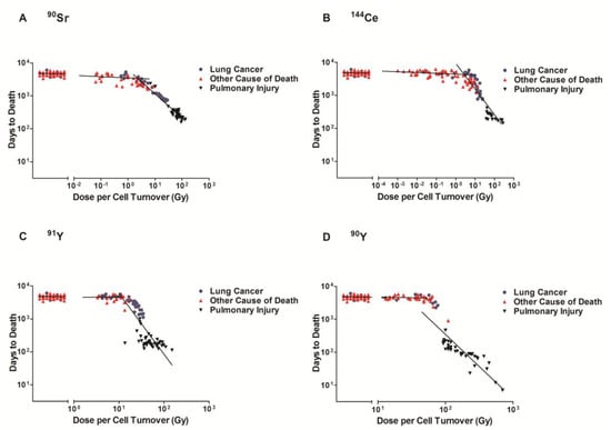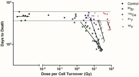 Dose per cell turnover was related to only the Beagle dogs that died due to lung cancer. Dose per cell turnover for 90Sr, 144Ce, 91Y, and 90Y in fused aluminosilicate particles was calculated as dose per cell turnover. Transformed dose per cell turnover were plotted against days to death following inhalation of particles for only the dogs that died due to lung cancer. Horizontal dotted lines indicate dogs that died due to spontaneous lung cancer that was not due to radiation exposure and were not included in linear regression analysis. Lines represent linear regression analysis of each radionuclide, where fit difference ranged from −0.54 to −1.38 (control was not significantly different from 0).