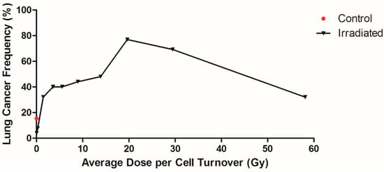 Review of the influence of dose rate on the key events in the critical pathways for the changes needed to take a normal cell to a cancerous cell have been evaluated and marked dose-rate effects found for most of these key events [,]. This manuscript is designed to evaluate the role of dose per cell turnover, tissue disorganization, and the breakdown of cell/cell and cell/tissue communication [,] increased cell turnover [], cell killing [,], and chronic inflammatory disease [,] on lung cancer induction. These effects show a threshold for dose-rate below which dose or dose-rate have minimal impact on cancer incidence in this dog model.