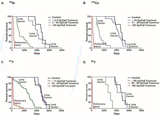 A Kaplan–Meier plot of dose per cell turnover on survival is shown along with the cause of death for each group. The percent survival of exposed and control dogs was plotted against days to death following inhalation of 90Sr (A), 144Ce (B), 91Y (C), and 90Y (D) in fused aluminosilicate particles of dogs that had lung cancer or pulmonary injury. Three distinct dose groups represent Gy/cell turnover: no significant life shortening or increased cancer frequency compared to control, significant life shortening with a very high lung cancer frequency and acute deaths (p < 0.05). Such data support the need for non-linear dose response functions and a change of paradigms toward total tissue responses and away from a single cell response.