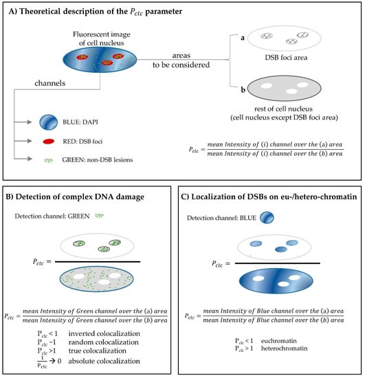 Although the in situ immunofluorescence has been extensively utilized for the detection of single/simple DNA damage including one type of lesions [,,,], the simultaneous detection of DSBs and non-DSB lesions has been reported only in a few studies [,,]. The difficulty in achieving visualization of base lesions, in terms of foci, lies in the fact that only a few molecules of every specific DNA repair protein (e.g., OGG1, NTH1, APE1 etc.) are taking part in the repair of a single lesion, in contrast with DSB repair where hundreds/thousands of molecules of the same DNA repair protein (like γH2AX/53BP1) may contribute to the process, as discussed above. Moreover, unlike γH2AX protein which becomes present mainly upon a DSB formation, most of the non-DSB repair proteins have endogenous concentrations within the cell nucleus, therefore resulting in increased background signal. A pre-extraction step in the experimental procedure, as well as the introduction of the Pclc colocalization parameter in image analysis [] have helped researchers overcome these obstacles (Figure 1). In Figure 1, the theoretical description of the Pclc-parameter is given in detail (panel A), along with its application for the detection of complex DNA damage (panel B) and an additional application for the derivation of useful data regarding the localization of DNA repair proteins in euchromatin/heterochromatin regions (panel C).