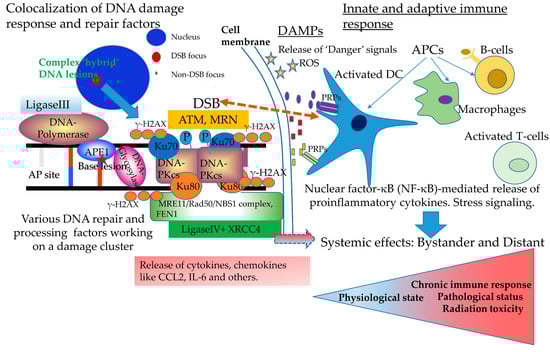 Linking processing of clustered DNA damage and immune response. I. The challenge of repairing a clustered damaged DNA site: a task for real survivors. Upon the induction of clustered DNA damage consisting for example of one double strand break (DSB) and two oxidative DNA lesions like a damaged base (shown here with an asterisk) and an apurinic/apyrimidinic (AP) site, two at least DNA repair pathways and several DNA repair proteins will arrive at the same chromosome region. For the base damage, the primary pathway is the base excision repair (BER) while for the DSB, here we consider for simplicity only the non-homologous end joining (NHEJ). In all cases, the most basic proteins and enzymes are also described in the main text. Last but not least, as shown by advanced fluorescence microscopy and foci colocalization, each DSB is expected to be rapidly accompanied by the phosphorylation of thousands of H2AX histone protein molecules called γH2AX. The MRN complex functions rather as a sensor of DNA ends and activates ATM kinase. The ATM phosphorylates substrates such as Chk2, p53, and the H2AX in flanking chromosomal regions. II. Linkage to immune response. Processing of clustered DNA damage and especially of unrepaired orpersistent is expected to lead to senescence or cell death i.e., apoptosis, necrosis (accidental, non-programmed), and necroptosis (programmed). All these processes can trigger the extracellular release of diverse signatures of ‘Danger’ signals or Damage-Associated Molecular Patterns (DAMPs: ATP, short DNAs/RNAs, ROS, heat shock proteins (HSPs), high-mobility group box 1 (HMGB)-1, S100 proteins and others) []. DAMPs activate different pattern recognition receptors (PRPs) including for example Toll-like receptors (TLRs) and inflammasomes, a process that leads usually to inflammation and immune-related pathologies. Interestingly, recent evidence as explained in the main text, suggests a direct interactions between different PRPs and DNA repair proteins involved in DSB repair and others (Dashed arrow connecting DSB to PRPs). Cellular damage or death can also lead to the release of several cytokines and chemokines that can regulate immune responses. Activation of PRPs usually results in nuclear factor-κB (NF-κB)-mediated release of various proinflammatory cytokines like IL-6, IL-8 and others. The activation of antigen-presenting cells (APCs) like dendritic cells, macrophages will induce primarily the innate immune response (activation of T-cells) and most rarely by B-cells, the adaptive immune response. In all cases, the constituent and constant triggering of the immune system is expected to generate a variety of systemic effects on the organism and possibly pathophysiology, close to the damaged cells often called as “bystander” effects or distant. Overall, for the final assessment of radiation effects and the return to the physiological state, the role of immune response and the systemic nature of radiation is of enormous importance.