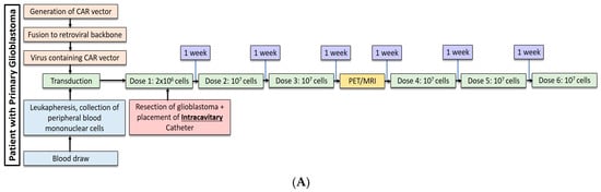 - Brown, C.E.; Alizadeh, D.; Ostberg, J.R.; Blanchard, M.S.; Kilpatrick, J.; Simpson, J.; Kurien, A.; Priceman, S.J.; Wang, X.; et al. Regression of glioblastoma after chimeric antigen receptor T-cell therapy. N. Engl. J. Med. 2016, 375, 2561–2569. [Google Scholar] [CrossRef] [PubMed]