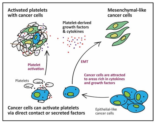 - Labelle, M.; Begum, S.; Hynes, R.O. Direct signaling between platelets and cancer cells induces an epithelial-mesenchymal-like transition and promotes metastasis. Cancer Cell 2011, 20, 576–590. [Google Scholar] [CrossRef] [PubMed]