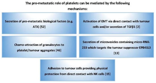 In addition to their pro-EMT role, Labelle et al. [] provided evidence for the prominent role of platelets in early metastatic niche formation. Platelet-derived, but not tumour-derived signals, as well as platelet aggregates around tumour cells, are essential for granulocyte recruitment to the early metastatic niche []. Platelet-derived chemoattractants such as C-X-C motif ligands (CXCL5/7) specifically induce deployment of granulocytes and not monocytes, lymphocytes or NK cells to the early metastatic niches []. Similarly, Orellana et al., recently demonstrated the chemotactic effect of platelets on ovarian cancer cells, with the subsequent phenotypic change favouring a mesenchymal phenotype []. Therefore, platelets not only provide survival signals for tumour cells but also recruit host cells to the disseminated tumour foci.
