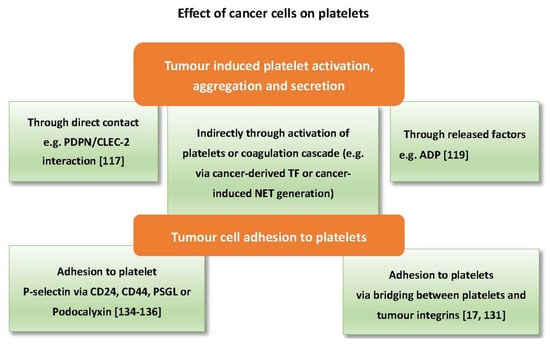 As mentioned earlier, cancer cell adhesion to platelets is vital for successful metastasis, which can be mediated through surface proteins and predispose platelet activation. For example, interaction between integrins (transmembrane glycoproteins) expressed on platelets (e.g., αIIbβ3), and some types of tumour cells via ligands that are normally present in plasma such as fibrinogen and fibronectin can lead to activation of platelets. Integrins are involved in tumour-platelet adhesion and subsequent tumour arrest within the blood circulation [,]. In addition to integrins, tumour cells can adhere to platelets via the P-selectin ligands. PSGL-1 as acts as a P-selectin counter-receptor in non-small cell lung cancer cells, multiple myeloma cells, and prostate cancer cells [,,]. Other P-selectin ligands, CD24 and CD44, are found on breast cancer cells and colon cancer cells, respectively [,]. In mice, engagement of P-selectin by PSGL-1 results in platelet activation and enhanced micro-aggregate formationwhile P-selectin null mice display inadequate thrombus formation []. Finally, podocalyxin is a membrane mucin protein expressed by testicular cancer cells that can also mediate platelet adhesion via P-selectin and integrins []. Figure 3 summarises the effects of cancer cells on platelets.
