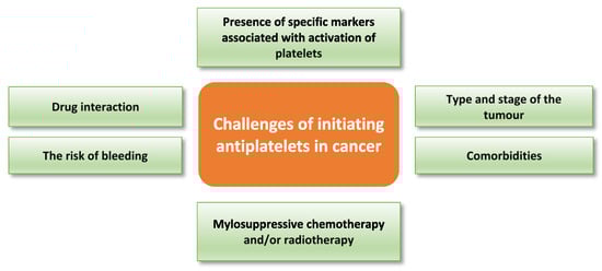 The use of antiplatelets in cancer therapy may be confounded due to declining platelet function as a consequence of disease progression, myelosuppressive chemotherapy and/or radiotherapy (reviewed by Liebman) []. For example, platelets obtained from thrombocytopenic cancer patients before platelet transfusion have shown impaired responses to thrombin, collagen-related peptide, and ADP as measured by αIIbβ3 activation and P-selectin translocation []. Thus, bleeding risk needs to be carefully evaluated, especially in cancer patients with comorbidities such as cardiovascular disease, before use of any antiplatelet drug. Although there is a well-established pro-metastatic role of platelets in cancer, the effect of platelets on cancer progression could vary based on type and stage of the tumour. Thus, the addition of antiplatelet treatment to cancer therapy should be individualised based on the clinical and experimental evaluation. Many factors must be considered before deciding to administer antiplatelets in cancer therapy; these include the risk of bleeding, comorbidity, chemotherapy and radiotherapy dose and duration, drug interaction, and type and stage of the tumour. Table 2 highlights the effect of a group of cytotoxic drugs on the platelet count. Platelet studies and presence of specific markers of platelet activation are among the experimental factors that should be assessed before administering antiplatelet drugs to cancer patients. Figure 4 highlights potential challenges with targeting platelets in cancer therapy.