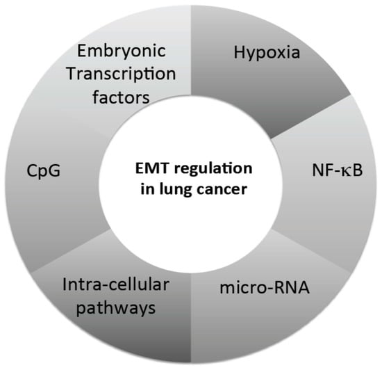 Hallmarks of the complex regulation of EMT in NSCLC. The regulation of EMT in NSCLC is based on several intricate conditions and actors, detailed in the Section 4 (adapted from [,,,,,,,,,,,]).