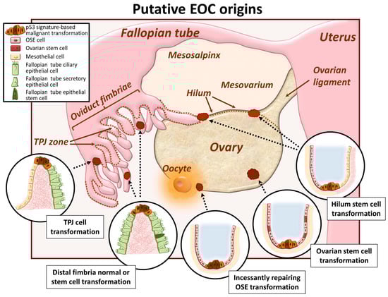 - Flesken-Nikitin, A.; Hwang, C.; Cheng, C.; Michurina, T.V.; Enikolopov, G.; Nikitin, A.Y. Ovarian Surface Epithelium at the Junction Area Contains a Cancer-Prone Stem Cell Niche. Nature 2013, 495, 241–245. [Google Scholar] [CrossRef] [PubMed]
