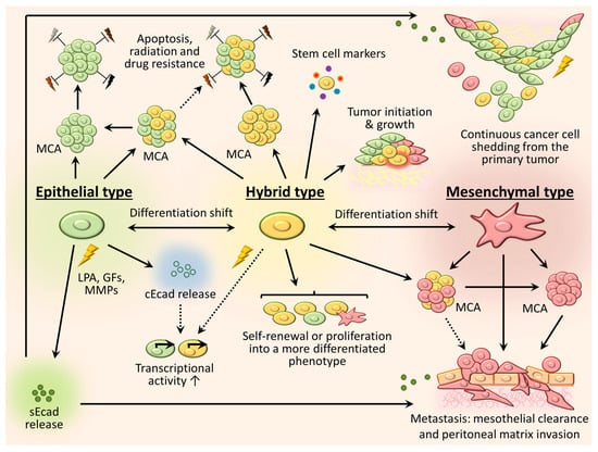 - Jolly, M.K.; Boareto, M.; Huang, B.; Jia, D.; Lu, M.; Ben-Jacob, E.; Onuchic, J.N.; Levine, H. Implications of the Hybrid Epithelial/Mesenchymal Phenotype in Metastasis. Front. Oncol. 2015, 5. [Google Scholar] [CrossRef] [PubMed]