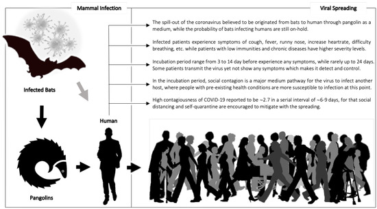 1]. Since the spark of the pandemic, there has been a strong continues international tendency to understand its spread and the fast pace of social contagions. In general, the epidemiological triad is considered when studying infectious diseases: (a) the virus itself to consider less virulent strains and the impact throughout the genetic mutations within its lifecycle, (b) the environment where the virus propagates and transmits—e.g., wind, heat, humidity, etc.—and (c) the host, as our primary focus, which refers to any being in which the virus survives and flourishes. Viruses are able to naturally mutate to spread and infect other hosts of different species ranging from insects to humans. Unfortunately, COVID-19 has already reached humans and now is able to quickly transmit from one human host to another. Different mediums of transfer are applicable to different viruses that target suitable host systems with immunity deficiencies. The immune system may be compromised due to pre-existing health conditions, some of which are chronic diseases such as hypertension, diabetes, heart problems, etc. Studies on COVID-19 have reported possible infection routes that are similar to those that have been observed for the seasonal flu, i.e., transmission through contaminated services or through the air in the case that the infected individual is at a close distance to others [