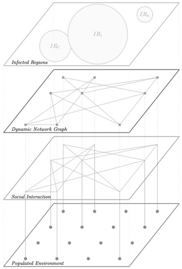 22]. Spatial agents’ interactions evaluate the viral flow of infections to enable, constrain, or limit the transmission [