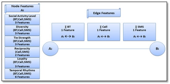 To define behavioral features that represent the nodes and edges using social-mobile data, we have surveyed the related literature which focuses on connecting phone behavior with social outcomes (e.g., [,,,]). For instance, some researchers have suggested that social capital is connected with phone use behavior [] and trust []. Social capital often contains two variations: bridging and bonding []. Thus, we link the notions of weak and strong ties to bridging and bonding social capital to infer interpersonal trust [,,]. We use call, SMS, and Bluetooth (BT) logs to represent the features that carry “social traits” concepts for mobility and interpersonal trust and their interconnections [,,]. Based on the BT, call, and SMS metadata collected from the app, we define the following set of phone-based features (n = 23).