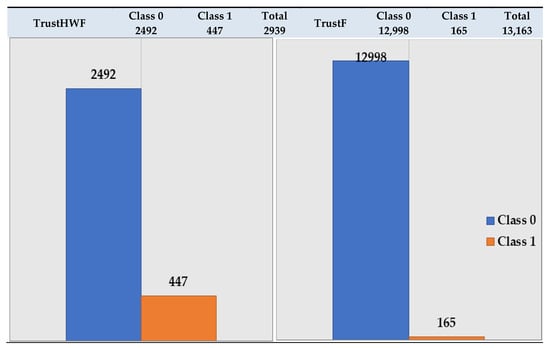 To clean our datasets (TrustF and TrustHWF), we have removed all instances without any logs for BT scans, Calls, and SMS messages altogether, resulting in 13,163 instances for TrustF. 12,998 of these instances have a low interpersonal trust (zero), whereas the rest of the instances (165) have a high interpersonal trust (one). For TrustHWF, 2492 instances have a low interpersonal trust (zero), whereas the rest of the instances (447) have a high interpersonal trust (one). Here, following Shmueli et al. [], we define trust level as high when the respondents answer any of the three questions about health, wealth, or family as true.
