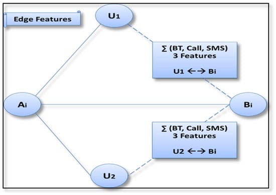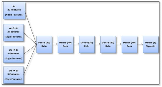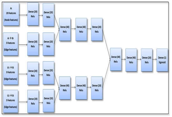 Hence, taking inspiration from Radu et al. [] and considering the different application contexts here, we define a novel architecture, as shown in Figure 4. This architecture builds upon feedforward neural networks and contains separate architectural branches for user Ai’s node and edge features as well as U1’s and U2’s edge features without any inter-branch connections between layers until later unifying cross-channel layers that connect the node and edge features for the Ai, and the three types of edges, respectively. It allows for the node properties of user Ai to go through several layers of neural networks to allow for different features and the interactions among them to become part of the model. The same thing happens to the other “channels” of information, i.e., the edge properties of (Ai → Bi), (U1 → Bi), and (U2 → Bi). Each of these properties goes through several layers of neural networks without any interaction across channels. Next, to learn the (potentially non-linear) interaction effects between the Ai’s node and edge parameters, the corresponding layers are merged and the resulting layer passes through multiple layers of networks to allow for learning of the appropriate parameters. Similarly, there could be interaction effects between the edge-based features for (Ai → Bi), (U1 → Bi), and (U2 → Bi), which can be learned by combining the corresponding layers and letting them pass through two layers of neural networks.