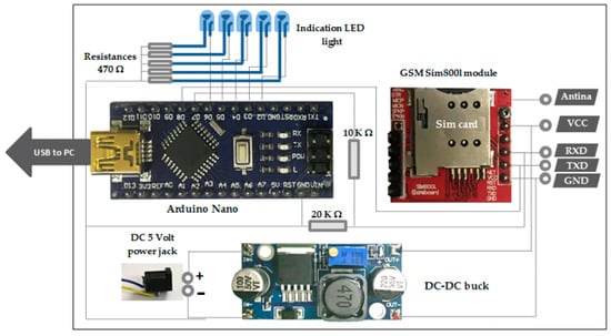 The GSM-module Sim800L was utilised in the practical circuit of the proposed system because it has a small size and can be used for making calls, sending messages and give GPRS data. The module transmitter and receiver pins connect with microcontroller via two digital pins. The module feed with suitable voltage level (3.7 Volt) through connecting Vcc and GND with a DC-buck chopper LM2596 [30,31] because the Arduino digital pin provides 40 mAmp which is not sufficient for GSM proper function [30].