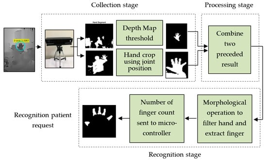 The Kinect V2 sensor provides depth information and skeleton data for up to six human bodies at once. A threshold-based segmentation to the depth frame using the z-axis was adopted in order to extract the hand mask. The resulting image was then smoothed by using a median filter [20]. The filtered image was combined with the cropped hand based on joint tracking to improve the result of hand segmentation. The diagram that describes the process for the first scenario is shown in Figure 4.