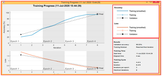 The network was trained using the GPU by default. Otherwise, it would use only the CPU. Figure 6 shows the deep-learning-training-progress and plots the mini-batch-loss (cross-entropy loss), the validation loss and accuracy (percentage of images classified by the network correctly).