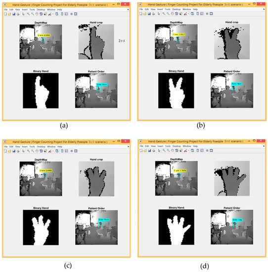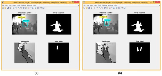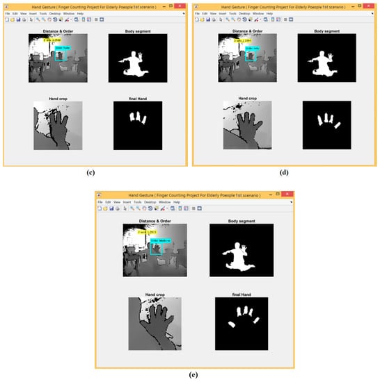 For the 1st scenario, the hand detection method based on depth threshold and depth metadata was used. The experimental results for the first scenario are shown in Figure 7 at which shows five different gestures based on finger counting.