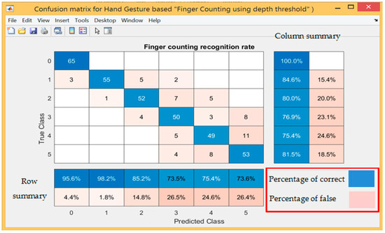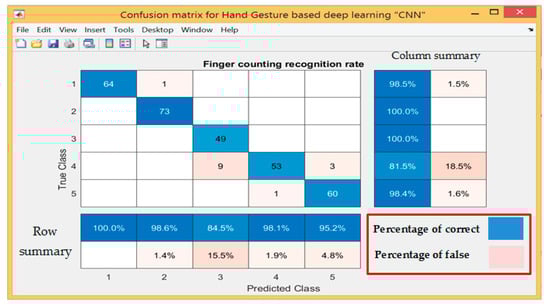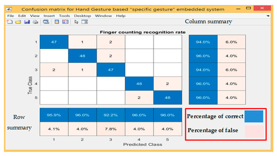 The confusion matrix was adopted to analyse the results of Table 4, which provide predicted and actual results for all tested gestures. Figure 8 shows the results of the confusion matrix and summaries of the predicted results and actual results in the form of row and column.