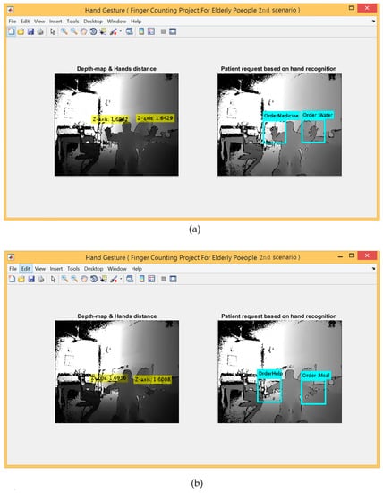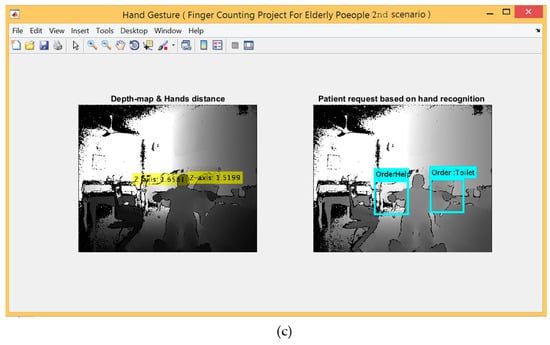 In this scenario, the metadata parameters were encoded for three different gestures performed by the right hands and two gestures performed by the left hands in order to represent five different requests and sent via GSM. The requests represented by the right hand are open hand, closed hand and lasso gestures, which indicate “Water”, “Meal”, “Toilet”, respectively. Whereas the remaining two requests represented by the left hand using (open hand and closed hand) that indicate “Help” and “Medicine”, respectively. This experiment used both hands to implement five different gestures, where every gesture indicates a specific request as a reverse of the first experiment that used only one hand to perform these five requests.