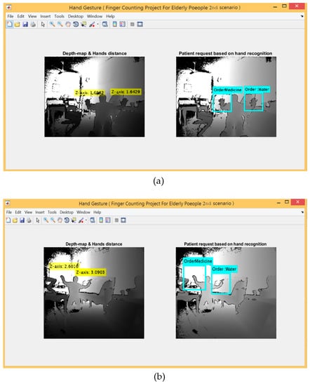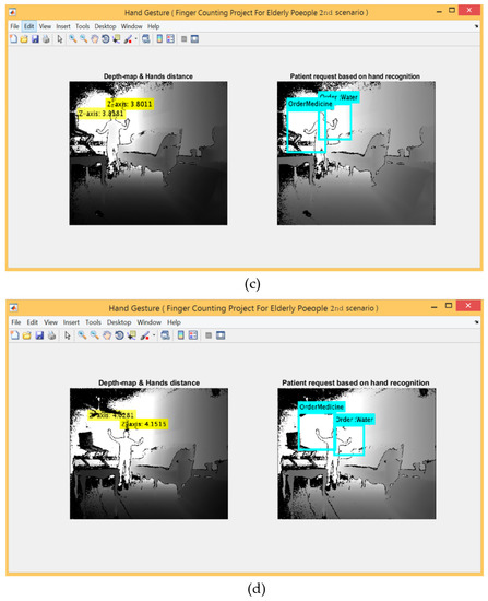 In conclusion, this study explored the feasibility of extracting hand gestures in real-time using the Microsoft Kinect V2 sensor under three scenarios: finger counting, the embedded system provided by the Kinect itself, and deep learning based on CNN. The proposed methods used the same practical circuit for each scenario, which reports that the correct SMS message sent to the care provider smartphone correlated directly with the results and accuracy of the recognition system. The experimental evaluation of the proposed methods has been conducted in real-time for all participants under three different scenarios. The experimental results were recorded and analysed using a confusion matrix which gave acceptable outcomes making this study a promising method for future home assisting care applications.
