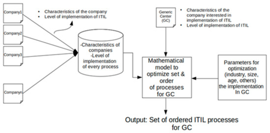 The next diagram (Figure 1) represents the methodology applied [24]: (1) The data gathered were stored in a database. These data were mainly the characteristics of the centers and their levels of implementation of every ITIL process. (2) Data from a generic center was required as well as the parameters used to generate the optimal set and sequence of processes. (3) The mathematical model was applied to obtain the set of ITIL processes (for their implementation) and their order (in which they should be implemented).