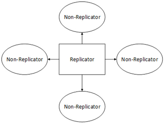 With the centralized replication approach, robots that have a replication-related capability are not buildable by the robot system itself. Initial or factory-made robots are solely used for replication related capabilities. A replicator robot is set up and acts as a replication center, as depicted in Figure 1. It is able to build robots that do not have replication-related capabilities that can collect resources or accomplish other goals.