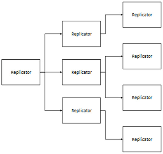 The hierarchical replication approach, which is depicted in Figure 3, is a combination of the centralized and decentralized approaches. Systems of this type are capable of building robots with replication-related capabilities as well as robots without these capabilities. The benefits and drawbacks of this approach are dependent on the ratio of robots with replication-related capabilities to non-replicating robots. At the extremes, the benefits and drawbacks approximate those of the centralized or decentralized approach.