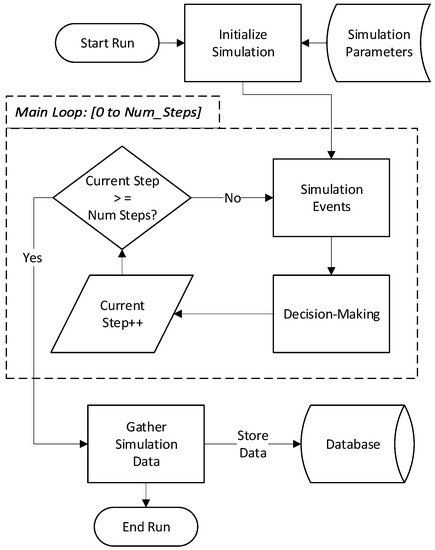 A simulation run is divided into a number of iterations (called time-steps). The number of time-steps for a given run is determined by user input. Each time-step corresponds to a block of time, with the simulation starting at time-step zero and progressing until the desired number of time-steps is reached (where each time-step corresponds with one iteration). In each time-step of the simulation, SRRS-simulated robots perform tasks which involve acquiring resources, converting resources, or assembling new robots. The following sections describe these in more detail, along with the operations of the simulation from a wholistic standpoint.
