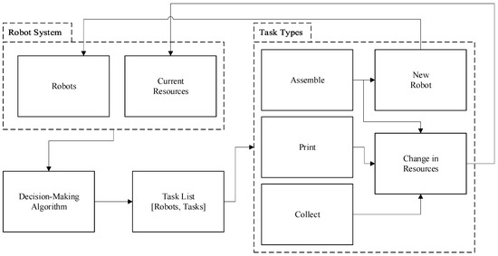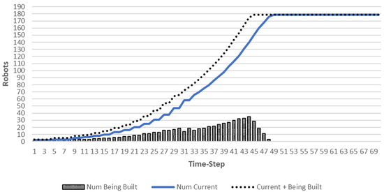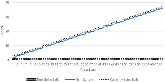 The material cost of each robot type is directly related to its capabilities. Capability costs for each included capability are added together to determine the cost of the robot type. For example, the normal robot type cost is just the base cost, while the printer robot type’s cost is calculated by adding the base cost plus the printing capability cost. This work assumes that the robot design for each robot type is similar and the added cost per additional capability would be the cost of upgrading the normal robot type to have that additional capability. The default values (i.e., initial parameter values) for these costs are listed in Table 3. These values are simulation parameters and can be adjusted from run to run of the simulation, to define the experimental conditions that are being studied by each simulation run. For example, the 3D-printed 3D printer described in Section 3.5 requires approximately 3.1 kg of PLA filament and approximately 1.64 kg of nonprintable components (stepper motors, heated print bed, and control electronics) [28]. In this example, the ratio of printable component mass to nonprintable component mass is 2 to 1. This is just one example and the units of the simulation are not set, but rather represent ratios of resources.