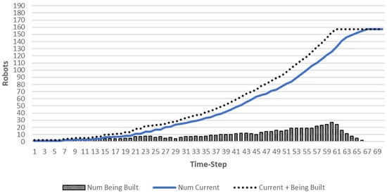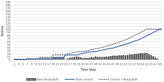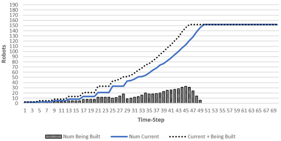 The results of the default experimental condition (A0) support the hypothesis that the heterogeneous DHE and HHE configurations produce robots more rapidly than the homogeneous DHO and HHO configurations. Under this experimental condition, the DHE and HHE configurations reached the resource-constraint-based maximum number of robots by time-step 50 (as depicted in Figure 5 and Figure 7). In contrast, the DHO and HHO configurations showed a more linear build rate, which reached the maximum number of robots around time-step 70 (as depicted in Figure 6 and Figure 8). Thus, the DHO and HHO configurations outperformed their heterogeneous counterparts in terms of assembly and print capacity by time-step 70. This supports the hypothesis that the homogeneous production approach would have a greater assembly capacity and print capacity than the heterogeneous production approach at later time-steps.
