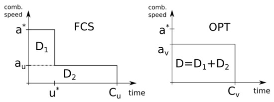 In general, the FCS schedule and optimal schedule have forms as shown in Figure 1. Both schedules perform the same amount of work, so the areas under the left and right plots (time multiplied by the processing speed) are the same. The FCS schedule runs in combination with the maximum speed until the completion of any of its tasks. We denote the duration of the first combination run as . After this combination finishes, the schedule proceeds with the remaining combinations of active tasks until all the work is completed. We denote as an average speed of all the remaining combinations until the end of the schedule (at the time point ), so . Similarly, the optimal schedule runs combinations at the average speed , performing D units of the total work until completion at time point .