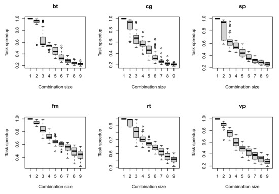 The aforementioned constant corresponds to the maximum slope of the task speed value when the size of the combination increases. We measured task speed as a function of the combination size in experiments, and the results for some benchmarks are shown in Figure 2. Each plot corresponds to a benchmark application running on six cores (out of 20) in combination with other benchmarks running on a random number of cores from 2 to 6. The data were collected in the following way. The combination with the maximum number of tasks was picked at random and the speed of the target task was measured in this combination. Then, a random task was removed from this combination and the target task was measured in a new combination. This process was repeated until the target task was the only task in the combination, i.e., it was running in ideal conditions. At least 30 combinations with the largest size were generated. Each plot shows how the distribution speed value of the task changes depending on the combination size.