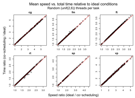 The results of experiments with a random number of threads per task are shown in Figure 4. Since the plots for other experiments’ results look the same, we present them as Table 2 with linear regression values. The results show that for all benchmarks tasks the ratio of processing times in co-scheduling and ideal conditions matches exactly with task speedup. That is, task speed measured using formula (30) in runtime is proportional to the speed measured after completion (by dividing the work units by the total time).
