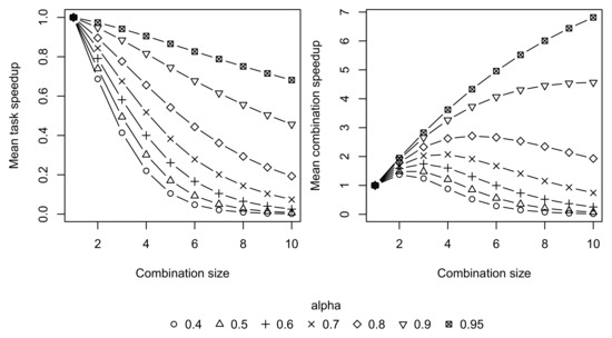 Task speedup and combination speedup values corresponding to different values are shown in Figure 5. The smaller values of correspond to the smaller values of task and combination speeds. While all task speed values decrease, their sum, i.e., combination speed, may increase and may reach a peak value for combinations with fewer than n tasks.