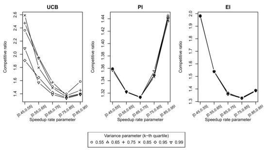 The results of the simulations for these systems are shown in Figure 6 and Figure 7. The competitive ratios of UCB, PI and EI strategies as a function of speedup value ranges () for different values of variance parameter (k-quartile in (26)) are shown in Figure 6. For the UCB strategy, it can be noticed that its competitive ratio decreases with an increase in k, i.e., with a decrease in confidence interval width. The competitive ratios of PI and EI strategies are not affected by the changes in k. The effect of the on the competitive ratio is not monotonic for all strategies and the larger deviation from the optimal strategies is reached at the border values of ranges.