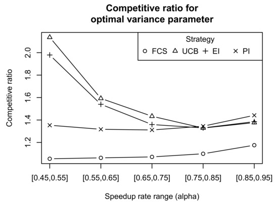 Figure 7 compares the minimal competitive ratio (which is achieved at ) as a function of the range. As expected, search-based strategies performed worse than the FCS strategy. The maximum competitive ratio of 2.6 was reached by the UCB strategy for . For the lower ranges of , the difference between search-based strategies was less pronounced. Based on these simulation results, we can claim that the PI strategy produced better results for all the tested ranges of task speed values. UCB and EI showed worse competitive ratios for larger speedup rate ranges.