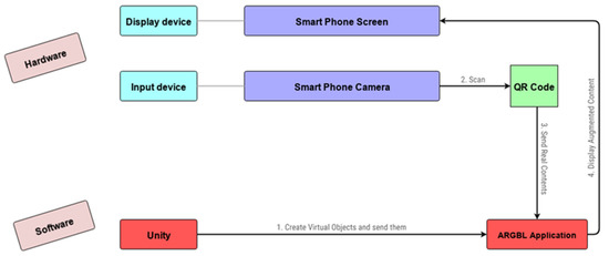 In this section, the system overview of the ARGBL application is presented. The system consists of the following components: (a) a smartphone device (hardware), and (b) the Unity platform (software), as shown in Figure 1. More analytically, the ARGBL application was implemented using the free version of the Unity game engine and C# as the programming language. The Unity platform was chosen because Unity software is powerful, easy to use and free [36]. Vuforia SDK was also used to ensure a better AR experience. At first, Unity sends the virtual content to the ARGBL application. Then, the input device, which is the camera of the smartphone, scans the QR code of the textbook and sends the real content to the ARGBL application. Subsequently, the ARGBL application processes the virtual and the real contents and finally displays the augmented content through the smartphone screen, which is the display device.