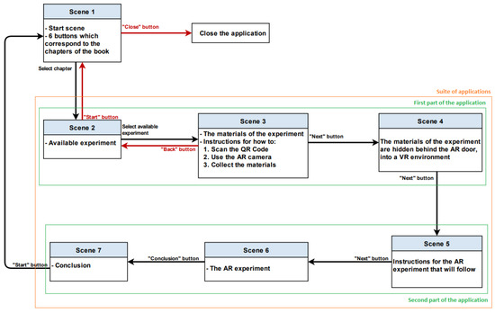 According to the student’s choice, instructions are displayed (Scene 3) about how the experiment will be performed using the AR technology. In the next scene (Scene 4), the camera of the user’s device is activated, and by scanning the QR code of the textbook page where the experiment is located, an AR door appears. Entering the door, the user is immersed into a VR environment. There are hidden virtual objects that must be collected in order for the educational experiment to be implemented, by using AR. At the bottom of the screen, there is a list with all the materials of the experiment which are hidden behind the AR door. In order for the user to proceed with the experiment, they must first collect all the materials by clicking on them in the VR world. Then, the materials are automatically checked in the list. It is basically a treasure hunt game, representing the first part of the ARGBL application which is for entertainment purposes.
