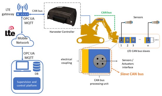 These modules will allow the equipment to have greater flexibility when needed to add new sensors/actuators, in addition to standardizing the communication between the controller and the processing machine, also reducing the existing cabling to only four cables; two for power supply, and a twisted-pair wire for communications (CAN high and CAN low). These communication modules also allow remote access to sensors and actuators in tele-maintenance and tele-assistance scenarios. With the machines operating in the forest, access is made through a mobile communications network, where an LTE/CAN bus gateway is used, enabling remote access to the machine devices, communicating with supervision and control platforms through OPC UA or MQTT.