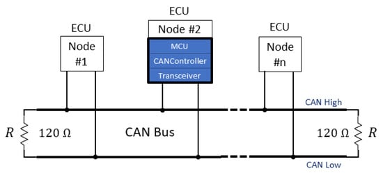- Broyles, S. A System Evaluation of CAN Transceivers. Tex. Instrum. 2002. Available online: https://www.ti.com/lit/an/slla109a/slla109a.pdf (accessed on 3 November 2021).