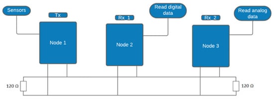 CAN bus was initially designed to be applied in the automotive industry to provide better and more efficient communication of automotive networks at a lower cost. However, with the advances of technology, CAN became suitable for many other applications in different branches of technologies. In [6], a master-slave control strategy of a microgrid over CAN bus is presented, to control parallel DC/AC inverters. In [7], CAN is used as a means of communication in the control of velocity and position in motor driver modules, to overcome the limitations of RS-232 and RS-485. In [8], a CAN bus based human motion capture analysis system is presented to provide data support for a motion recognition algorithm to help elderly people walk normally. In [9], a scheme for PLC accessing the CAN bus network is presented, based on a 32 bits microcontroller. In [10], an interface USB module is presented to connect a computer directly to the CAN bus network to provide CAN data analysis. In [11], the authors present a multi-node calibration system for CAN bus networks. In the field of autonomous vehicles, a CAN bus has an important role as a means of communication between sensors and actuators installed on vehicles, and in [12] the authors present electronic control units (ECU) that communicate via CAN bus in tests of self-driving cars. In [13], an electrical control system based on CAN bus for thermoelectric plants is proposed, where sensor signals are collected in real time and the pressure in the network is controlled by a microcontroller. In [14], the authors present a gateway implementation for remote monitoring, management, and fault diagnosis of vehicles, performing the connection between the vehicle CAN bus network and mobile communication network. In [15], CAN bus is used in satellite systems as a means of communication between different modules to provide redundancy and a fault-tolerant system.