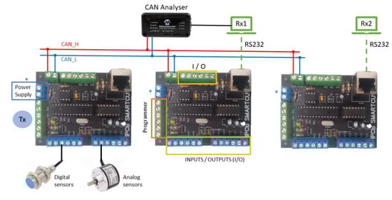 Initially the case study aimed to carry out the transmission of digital and analog signals by using three nodes, where one node was responsible for sending messages carrying an ID with different DLC and data according to the sensor that is activated. The second and third node were designated to receive digital and analog data respectively sent by the transmitter node. The experimental setup for the first case study is shown in Figure 11, and more detailed in Figure 12, where it is used in the first node developed, named “IPCB SMARTCUT v00.2021”.