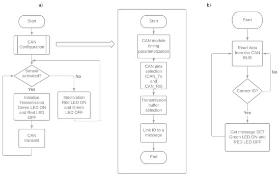 For the receiving nodes the same concept is used, this time to signalize the message reception. The first receiving node has four LEDs in groups of two (red and green) to signalize the reception of a digital signal from the two inductive proximity sensors and the second node with two LEDs; however, the LED that signalizes the reception of the analog conversion has an LED configured as a PWM output to be compared to LEDs from the transmitter node. The process of the transmission and reception of CAN messages are described in the following flowchart in Figure 13.