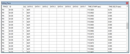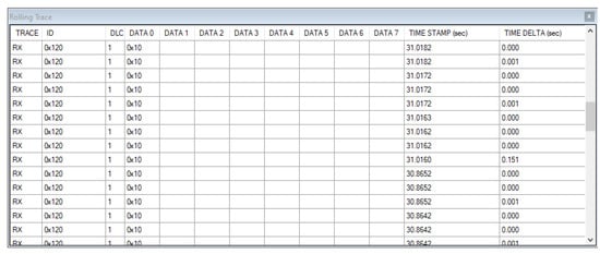 Besides confirming the reception of the messages in the corresponding nodes and the parameters defined, CAN Analyzer also provided the time stamp that indicated the moment a CAN message was received and the time delta, which indicated the difference from the last message on the bus based on the last message received regardless of the ID (rolling trace configuration).