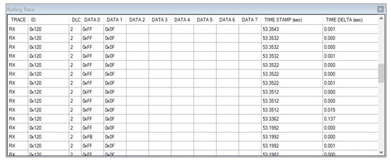 By using this device, it was possible to confirm the reception of the messages transmitted, visualizing the identifier of the message and the data length code. The data that were transmitted are shown in Figure 14, Figure 15 and Figure 16.