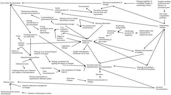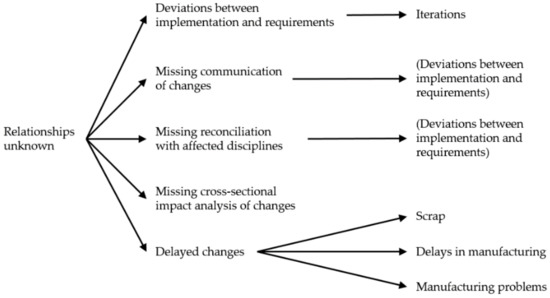 Before describing the requirements and use cases, we present problems related to complexity management in the product development of SMEs. Next to eliciting requirements from the interviews with Company A and Company B, the cause-and-effect relationships of these problems could be retrieved. We use the concept of a system dynamics model (SDM) developed by Jay Wright Forrester [42]. SDMs help to model the structure and behavior of systems, in particular, modeling socioeconomic systems for supporting management decisions. An SDM is a causal loop diagram for the qualitative representation of cause-and-effect relationships. SDMs are generally auto- and cross-correlated and contain loops and delays as relationships between the systems’ components. Figure 1 shows the SDM elicited through interviews with Company A and Company B. The SDM contains positive relationships only and no loops. “Relationships unknown” between system elements represents a major source and sink for variables, and “deviations between implementation and requirements” a major sink. Figure 2 illustrates the first and second-order effects of unknown relationships on time, cost, and quality variables.